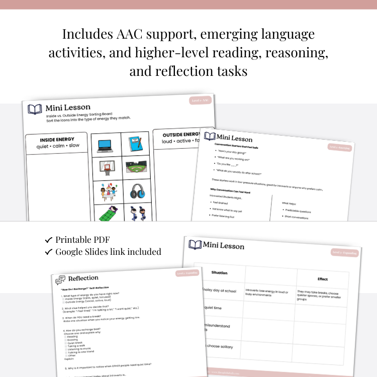 Students explore inside vs. outside energy, self-advocacy, and communication preferences through the lens of introversion — perfect for mixed-ability groups.
